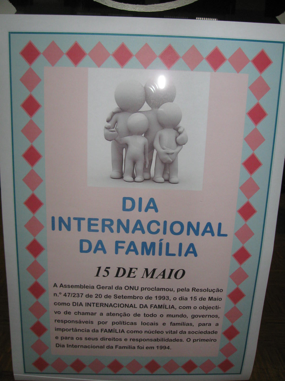 Por proposta da Organização das Nações Unidas (ONU), desde 1994 o dia 15 de Maio de cada ano assinala o Dia Internacional da Família, como forma de reconhecer o papel nuclear da família na sociedade e de impulsionar a adopção de medidas no plano nacional e internacional para melhorar a condição da família.
